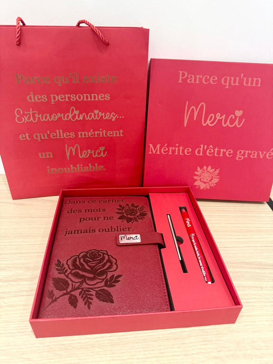 ✨ Coffret Cadeau "Merci" – Carnet & Stylo Gravés avec Boîte Message