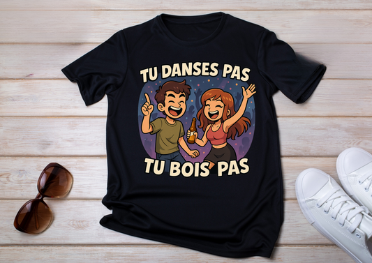 T-shirt Humour Soirée – "TU DANSES PAS, TU BOIS PAS"
