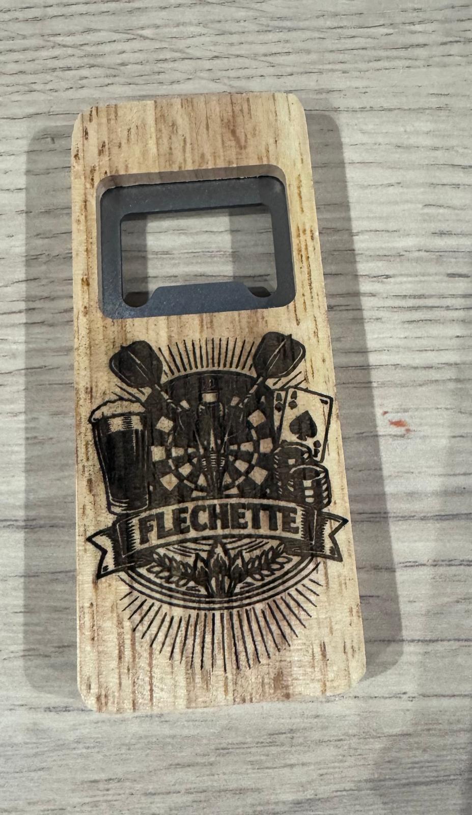 đș DĂ©capsuleur en bois gravĂ© â ThĂšme flĂ©chettes