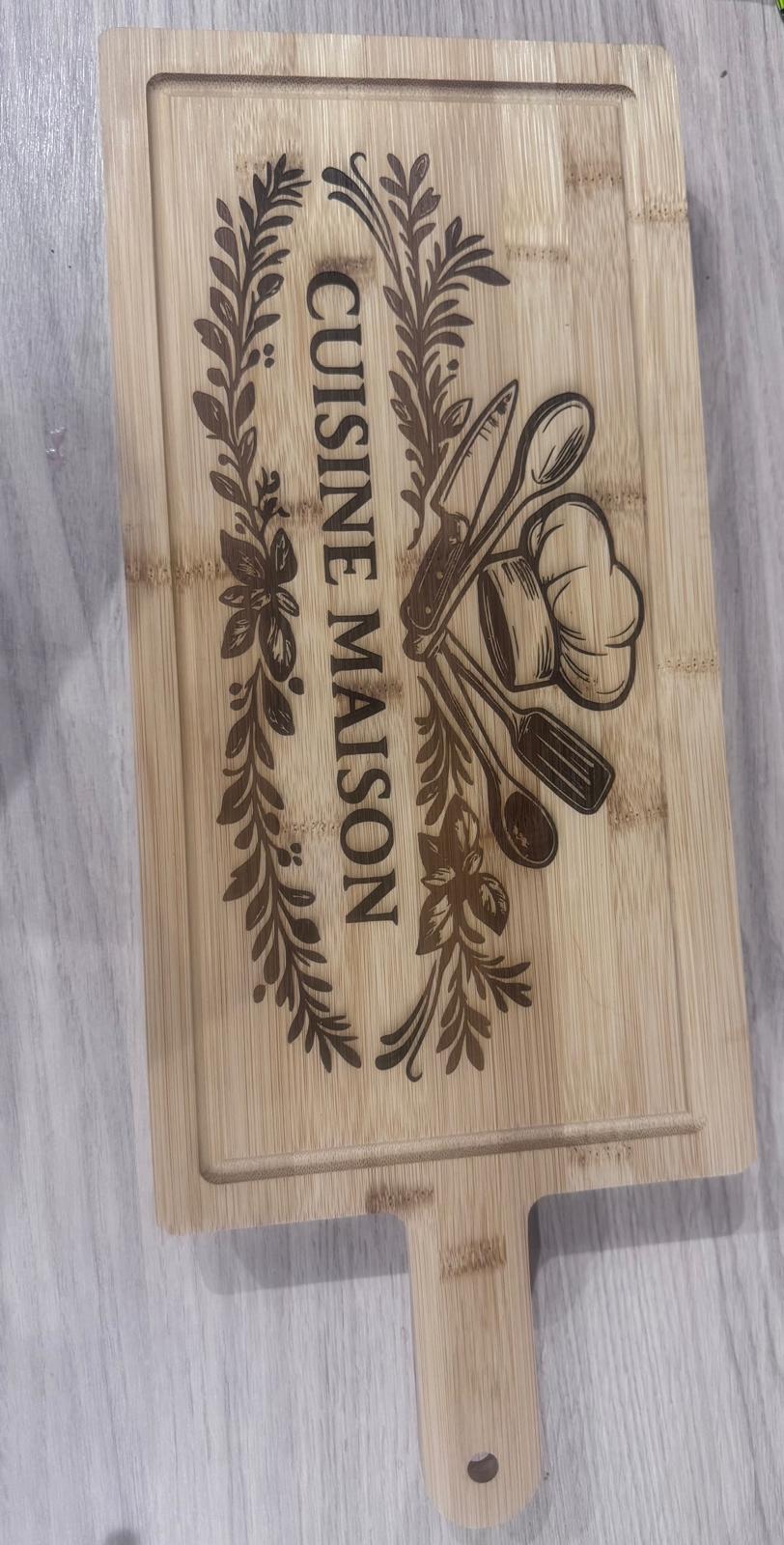 Cette planche en bambou naturel séduit par son design élégant et intemporel. La gravure laser « Cuisine Maison », accompagnée de motifs culinaires (toque, ustensiles, feuillage), lui donne un style rustique chic, parfait pour une cuisine conviviale et familiale.