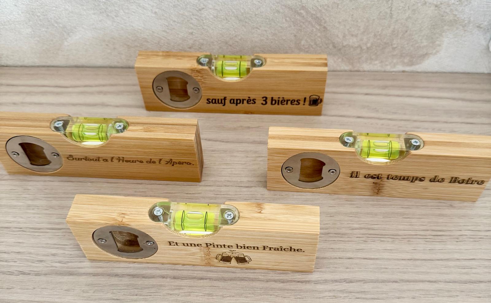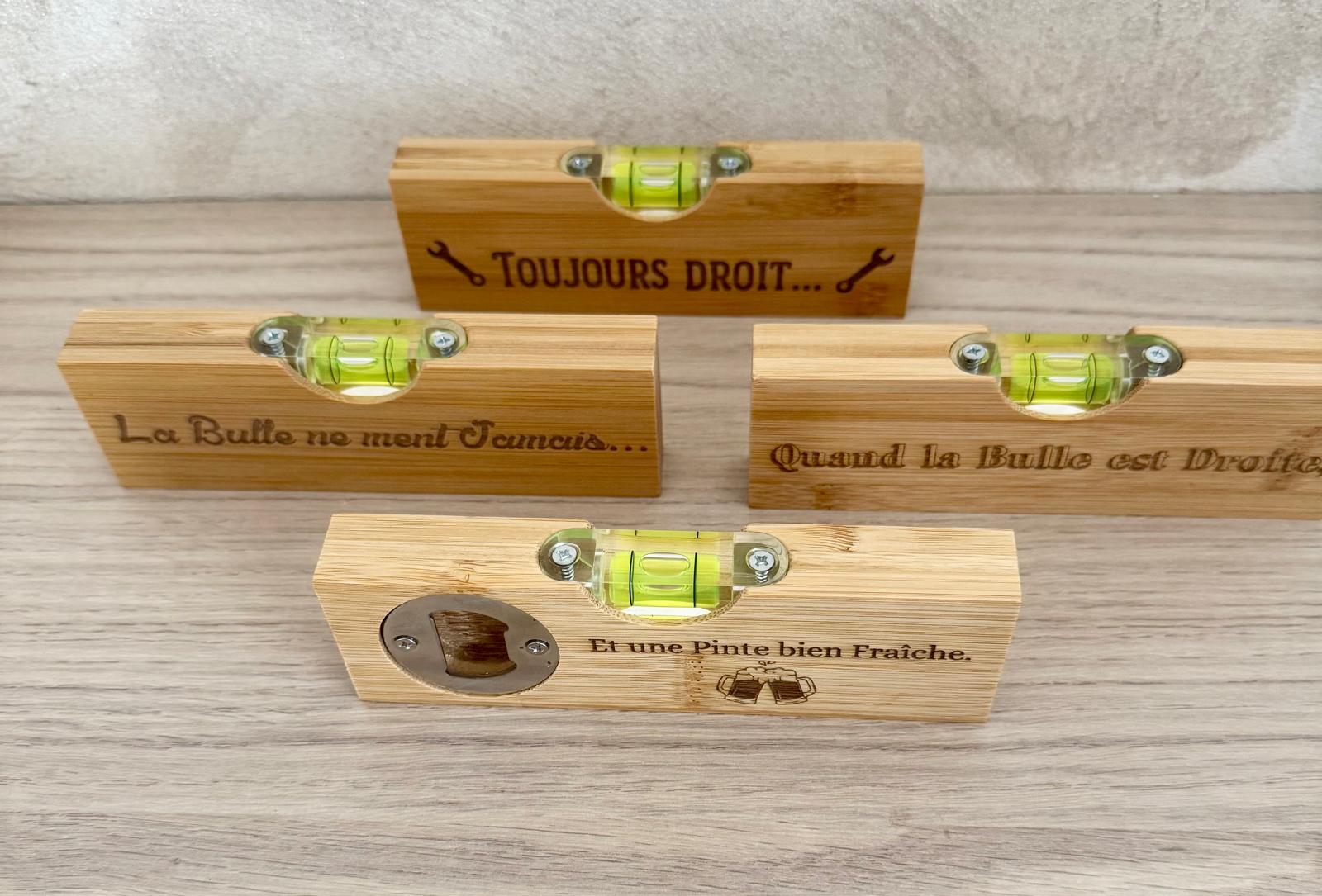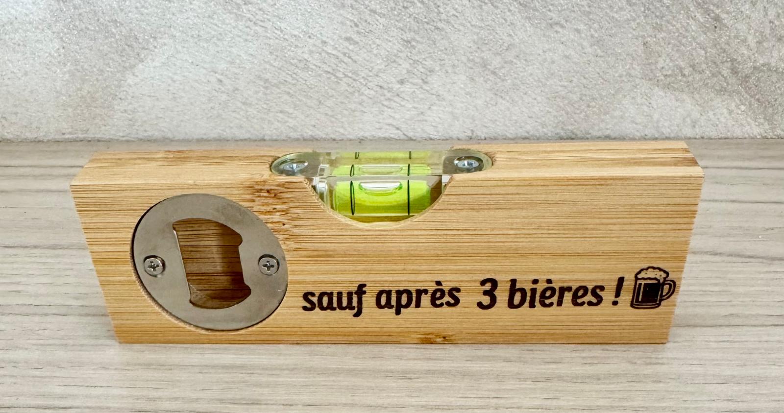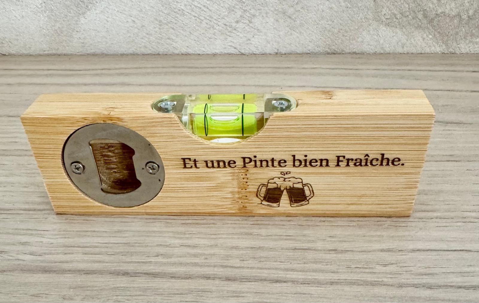 Gravé dans notre atelier en France, ce niveau en bambou associe précision et humour. Choisissez l’une de nos phrases pleines d’esprit ou personnalisez avec un prénom. En version avec décapsuleur ou sans décapsuleur, il trouvera sa place dans l’atelier, le garage… ou près du frigo 😉.