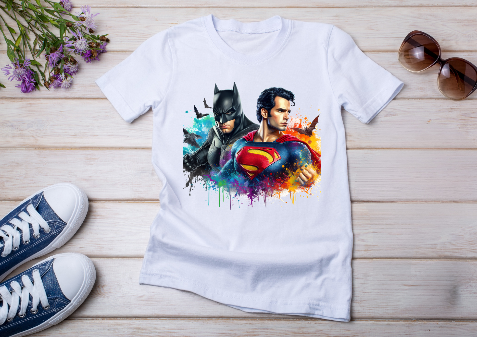 Affiche ton style héroïque avec ce t-shirt unique représentant Batman et Superman dans un design artistique éclaboussé de couleurs. Idéal pour les fans de comics et de super-héros, ce t-shirt unisexe apporte une touche moderne et audacieuse à ta tenue. Disponible en version blanche ou noire, ce vêtement de qualité promet confort et durabilité tout en mettant en avant ton côté geek chic !