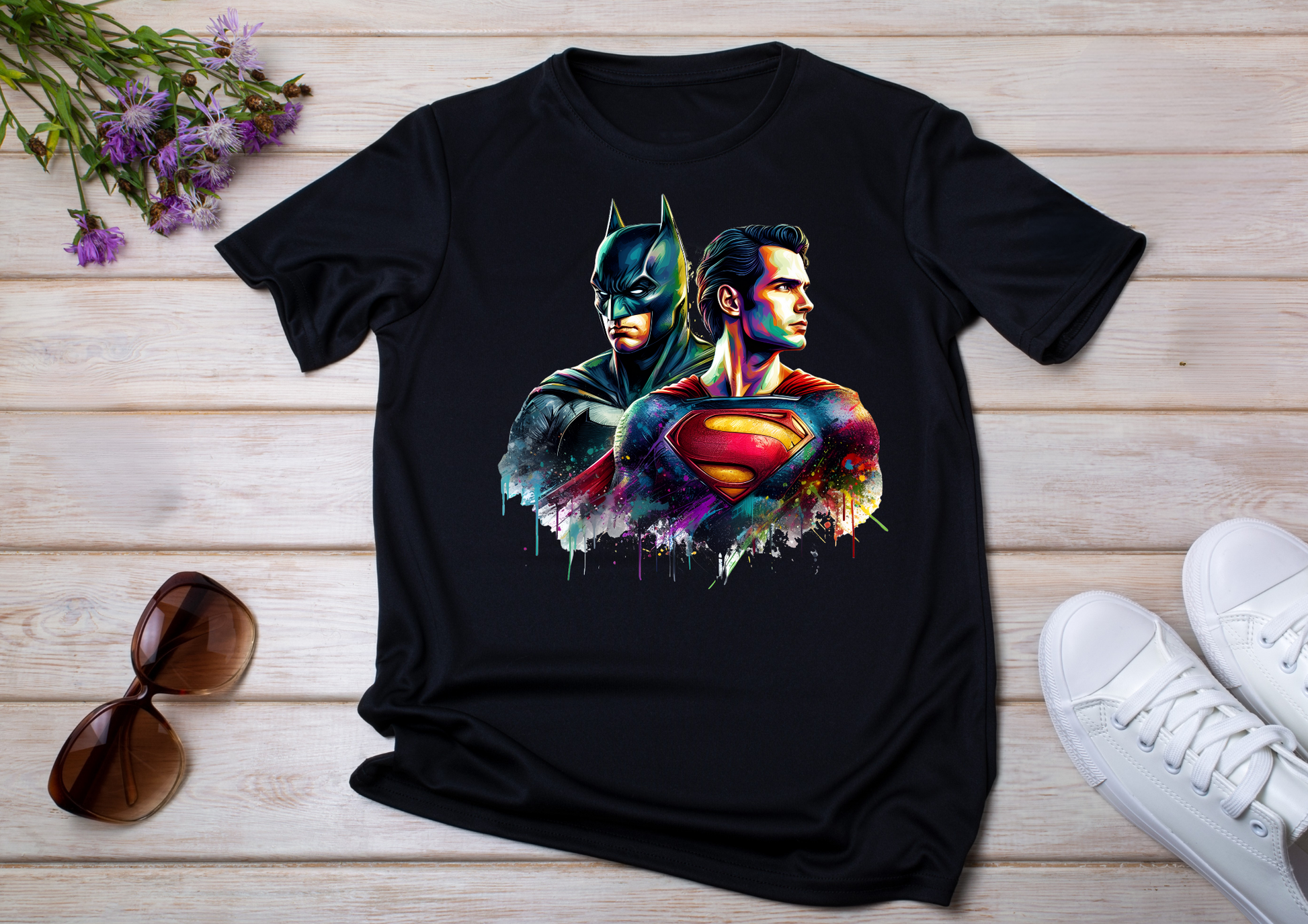 Affiche ton style héroïque avec ce t-shirt unique représentant Batman et Superman dans un design artistique éclaboussé de couleurs. Idéal pour les fans de comics et de super-héros, ce t-shirt unisexe apporte une touche moderne et audacieuse à ta tenue. Disponible en version blanche ou noire, ce vêtement de qualité promet confort et durabilité tout en mettant en avant ton côté geek chic !