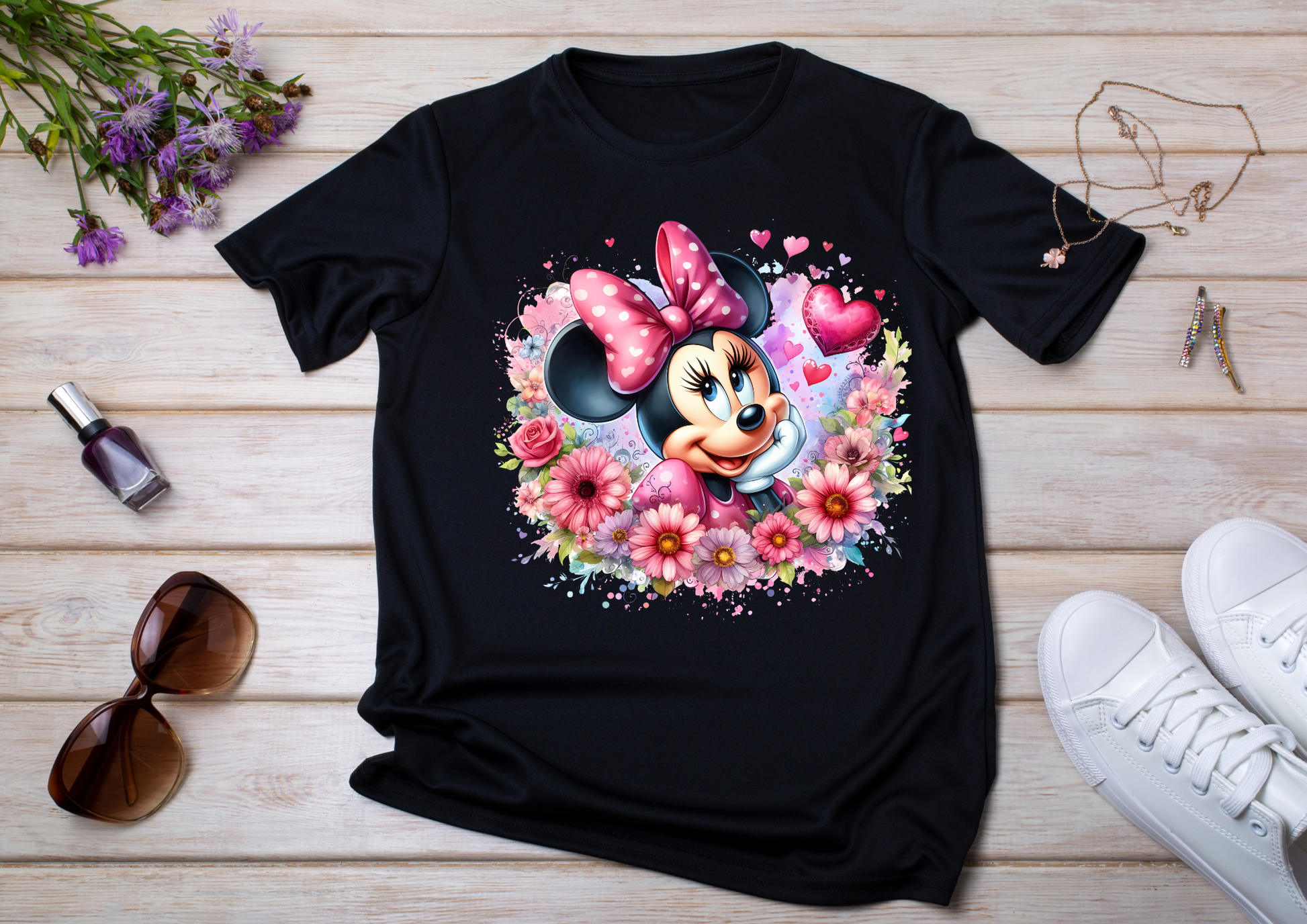 Un design intemporel de Minnie avec son grand nœud rose et son sourire joyeux, entourée de fleurs douces et colorées.
