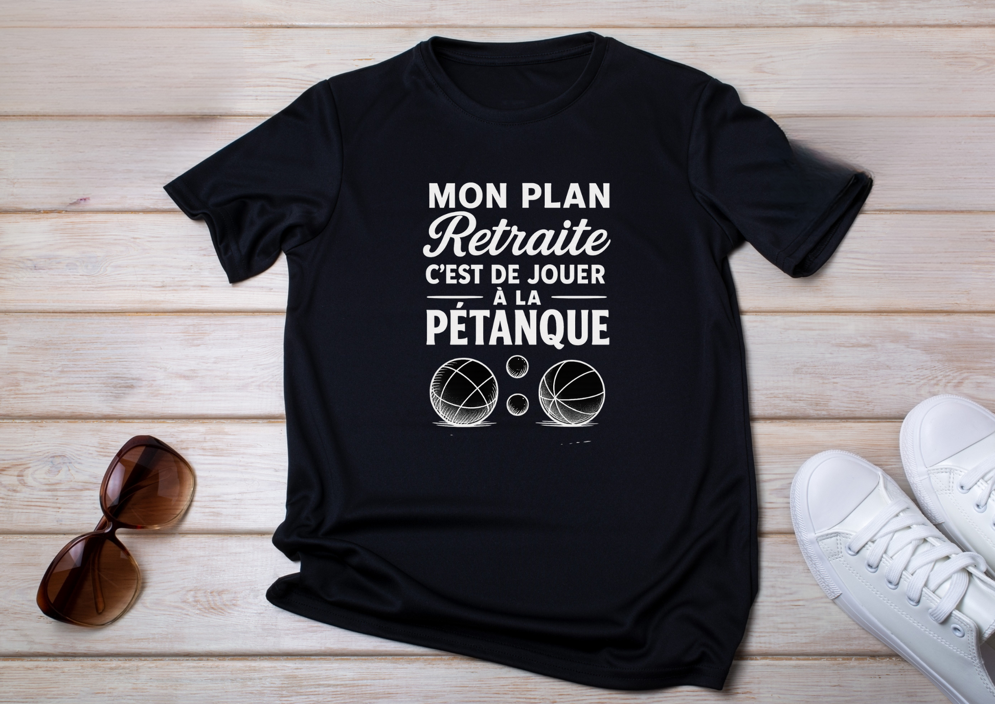Parce que la retraite, ce n’est pas seulement le repos mais aussi le plaisir de jouer aux boules, ce t-shirt « Mon plan retraite c’est de jouer à la pétanque » est fait pour les passionnés de ce sport convivial.